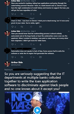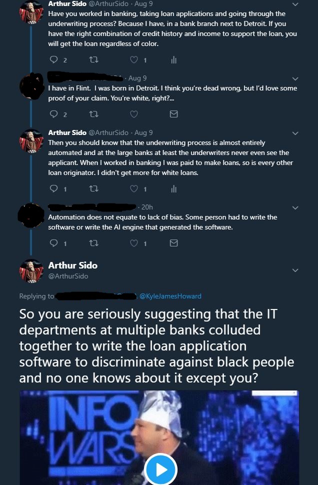 The thread devolved into a discussion of alleged discrimination against black mortgage applicants. Yeah, I know. Here is the thread in a couple of parts, I added the one where a lady said that my experience in lending is negated by being white. Although these are public tweets and you can easily find the names, I still marked out the names and avatars to protect the ignorant innocent.