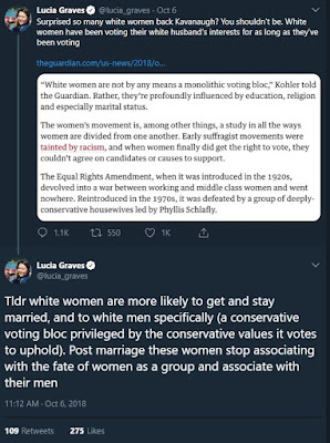 A few weeks ago a black man, Jamal Simmons, wrote a piece for The Hill titled: Understanding ‘the white women thing’. Think about the arrogance of that. Then think about what the response would be to a conservative white man writing an article titled “Understanding the black women thing”. Of course those sorts of blatant double standards never get much attention. Other similar article are springing up. White women as a group are being blamed for all sorts of stuff, like this tweet demonstrates: