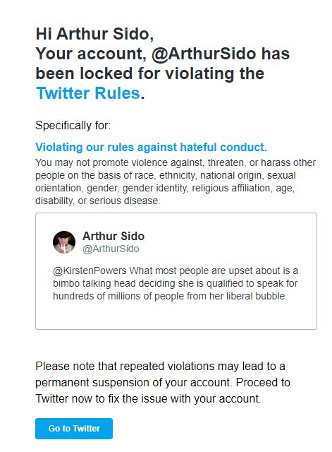 To my everlasting shame I have somehow been on social media for many years and never received a stint in Facebook jail or a Twitter suspension. Until now. I got the sternly worded email yesterday declaring that I had engaged in “hateful conduct” and would now be punished until making sufficient oblation to the social media demigods. What awful thing did I do? Did I use the “c” word in describing a woman? Suggest Mohammad was a pedophile? Use the word nigger in any context? Nope. I referred to a woman as a “bimbo”. My mistake, she is a liberal blue checkmark so therefore she is a protected class. Here is the email from Twitter: