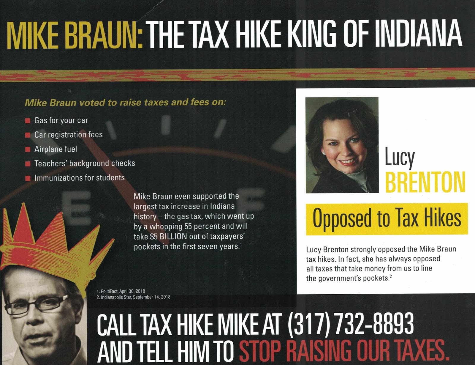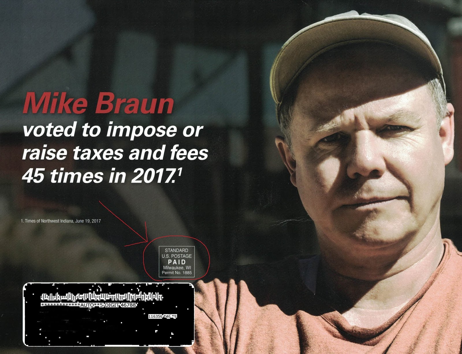 Don’t believe me? Well we are receiving fliers praising Lucy Brenton and attacking Mike Braun but they are not being sent out by the Brenton campaign. Instead they seem to be coming from liberal groups that are trying to siphon off support for Braun to throw the election to Donnelly. We got this in the mail earlier this week (front and back of flier).