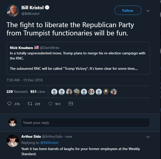 Bill Kristol, the effete, insufferable, smug boob that ran the once venerable magazine The Weekly Standard into the ground in no small part due to his single-minded obsession with Trump, is one of the least self-aware and borderline delusional people in the political scene today. He regularly holds forth on Twitter declaring himself the savior of conservatism, but ironically the only people that seem to reply are a bunch of leftists that share his hatred for Trump, plus a smattering of conservatives mocking him. Well he posted yet another tweet yesterday that is utterly lacking in any reality….