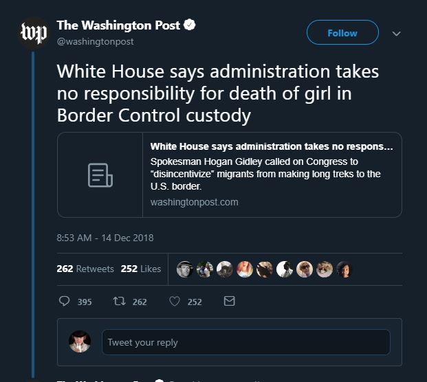 Why would the White House take responsibility for the death of a little girl that died from dehydration as the result of days of being without food and water before she even got to the U.S. border? If anyone dies anywhere in the world, is the Trump administration culpable? It is sort of the equivalent of the old gotcha question “When did you stop beating your wife?”.