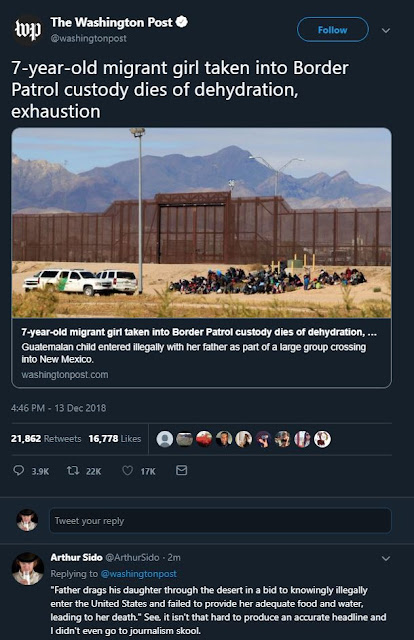 Also worth considering. If her father was an American citizen and took his 7 year old on a thousand mile hike without adequate food and water, and she subsequently died of dehydration, the media would be (rightly) calling for his head for child abuse and murder. But instead her death is being used as a political prop. Disgusting.