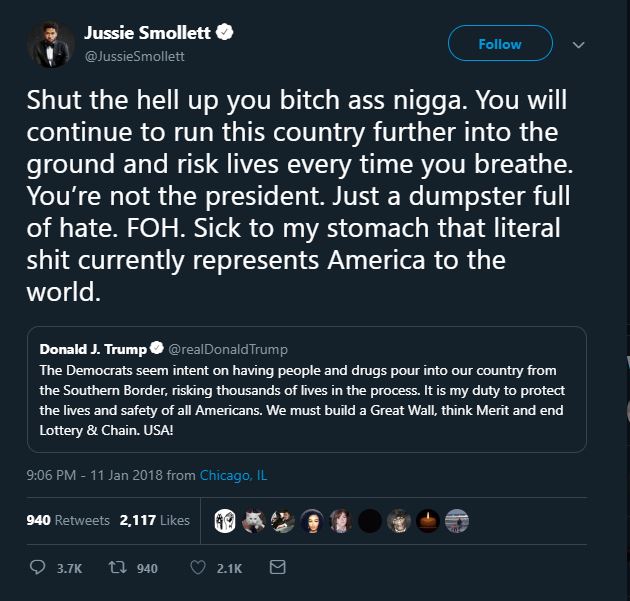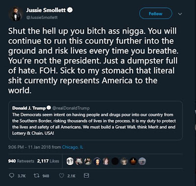 Nothing is more important than love, unless I don’t like your politics and then I will throw a vulgar, childish Twitter tantrum. A “bitch ass nigga”. Imagine the irony of a black man calling a white man a “nigga” and also calling him a “bitch ass” since the black man in question likes being penetrated like a woman. If you were to compare Trump with his supermodel wife to Jussie with his preferences, which man has a “bitch ass”?