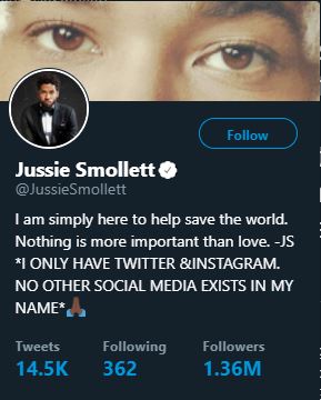 But who is this Jussie Smollett anyway? I saw an older tweet of his that set the irony meter off the charts. First, this is his Twitter bio…