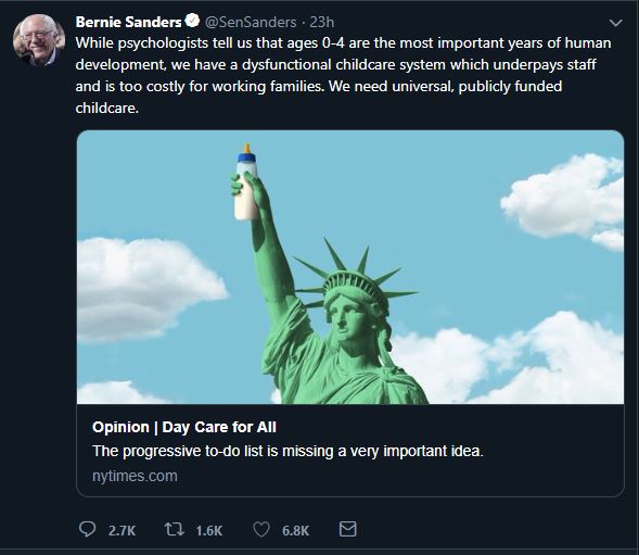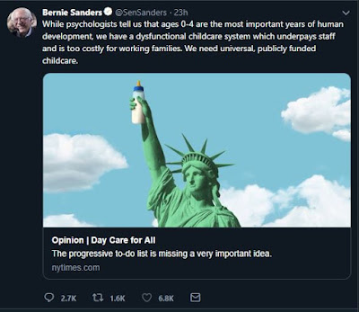 Maybe policies that encouraged parents, hopefully mothers, to stay home and raise their own kids instead of dumping them off in an institutional feed lot with dozens of other kids, might be better? But we don’t want that because people like Bernie think the very worst people to raise children are the parents of that child. I happen to think the best place for a child to be raised is by their mother in their own home but that means that kids might not get the proper indoctrination.