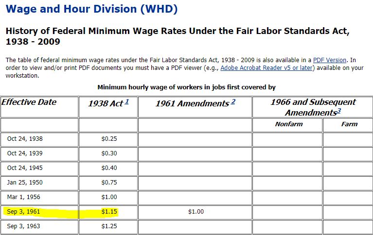 So working 40 hours per week at $1.15/hour works out to $46 per week or $2,392 per year. Was just shy of $2400/year considered a “living wage” for a family of three in 1961? Maybe but I kind of doubt it. If I am reading these goofy charts correctly, that would be below poverty level in 1961. That is because the minimum wage is intended for the very lowest skill jobs that require no experience. It isn’t intended to be a permanent wage for adults to earn while starting and raising a family. See They Are Called Entry Level Jobs For A Reason.