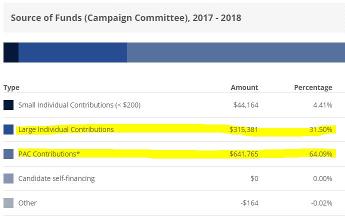 Wow, what a public servant. But it turns out she is bought and paid for by big business. From OpenSecrets.org we see this regarding the source of her campaign contributions: