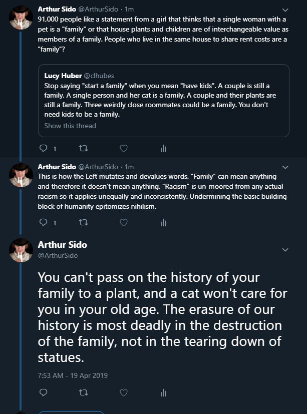 This is important. The saying “start a family” is not intended to denigrate anyone. It is just a simple phrase that indicates that a married couple is moving to the next natural stage, having children. Couples getting married and starting a family is how the species and the society is perpetuated. But a lot of people seem to really like this notion of redefining the word “family” to mean any sort of connection between people, or animals or even plants. I posted this short thread about her assertion: