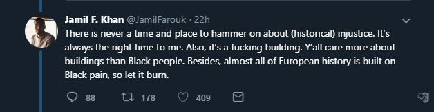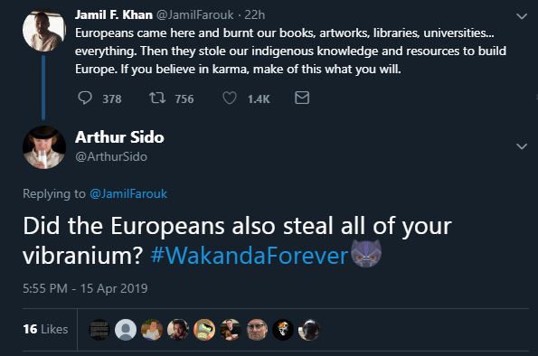 Others were gleeful about the “karma” of Notre Dame burning, some sort of cosmic retribution for French colonialism (that brought civilization to otherwise backward places). If so, karma isn’t terribly timely as the French haven’t been a colonial power for a long time and it sort of seems that they got their payback in World War I and II. I am not an expert on karma. Some even suggested that all of Europe was built by black people, a variation on the notion that white people in America just sat around on the porch while black people did all of the work and invention in the U.S.. Like for example self-proclaimed “thinker” Jamil Khan here: