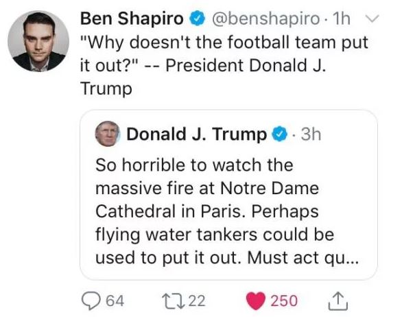 First Trump, a man incapable of not weighing in on any event, sent out a tweet expressing how horrible the fire was and then making the weird but harmless suggestion of using flying water tankers to put it out. That is pretty common in forest fires but wouldn’t work here for a number of reasons. That didn’t stop the court jester of “conservatism” from using the heart-wrenching events in Paris as his backdrop for making a dumb joke at the President’s expense.