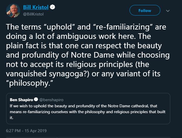 Nice that he put philosophy in snarky scare quotes. So as Notre Dame smolders, we have two Jewish guys arguing about the significance of one of the most significant Christian edifices in Western civilization in relation to centuries old religious conflicts between Christians and Jews. You can’t make this up.