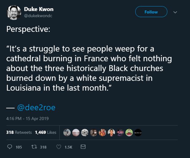 So some churches in Louisiana were burned and got some coverage in the US. A guy was arrested. Meanwhile a cultural icon with almost nine centuries of history is burning with worldwide live coverage. Notre Dame has been visited by tens or hundreds of millions of people, it is where Napoleon’s coronation was held and he was married. Henry VI of England was crowned in Notre Dame. It has survived the French Revolution and two World Wars. It held many Catholic relics which, while not authentic in any sense, are still icons of great significance to Catholics and to European culture. But hey, take this opportunity to publicly bitch and moan. If I were a suspicious type I would suspect that the fact that Notre Dame was built in a European nation by European men was the real source of her anger. Duke seems to find this very profound.