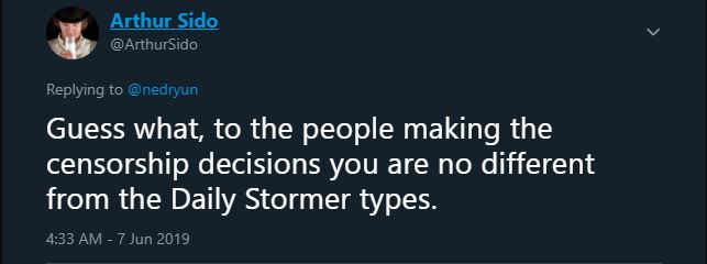 When you start off by surrendering the principle, you give up the fight. It isn’t a stretch to make a link from even a normie-con to the Daily Stormer so when they come after you, there isn’t really an argument to be made on principle, you have to fight about specifics.