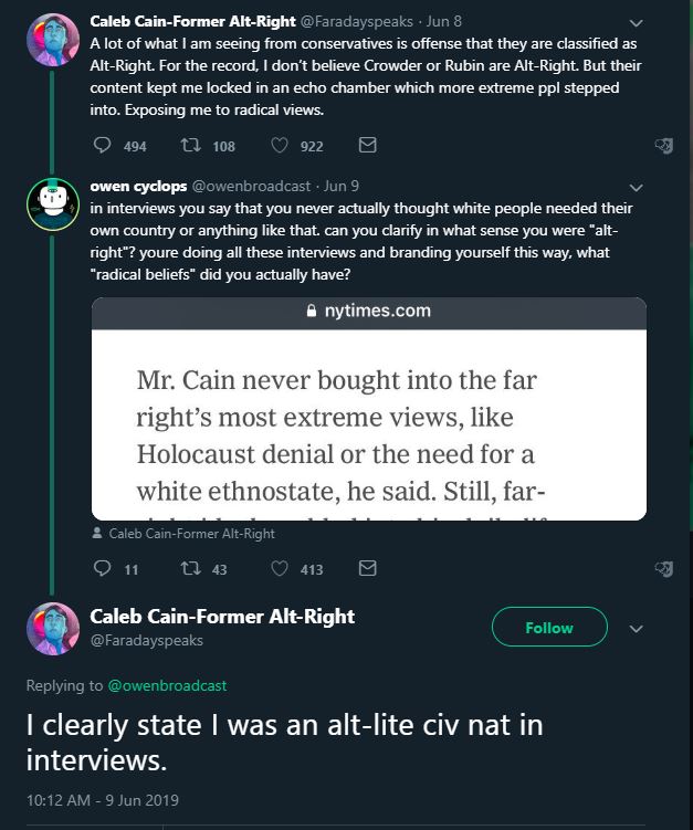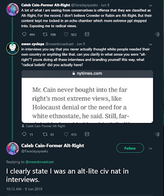 Some in the more mainstream conservative movement and the media see the alt-lite as a “gateway drug” to more “radical” positions on the Right. This is the basis of the shtick of Caleb Cain, someone nobody had heard of a few weeks ago, but who parlayed being a helpless 26 year old seduced into the alt-right by watching Youtube videos into a story in the New York Times. As I pointed out, when I was his age I was married, a college graduate, working full-time and already had three kids. This Caleb Cain sissy can’t even manage enough willpower and agency to stop watching Pewdiepie videos or something. He is clearly a shyster, calling himself by the cringe twitter name: Caleb Cain-Former Alt-Right while admitting he never actually believed in anything the alt-right believes in: