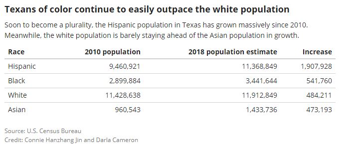 With Hispanics expected to become the largest population group in Texas as soon as 2022, new population estimates released Thursday by the U.S. Census Bureau showed the Hispanic population climbed to nearly 11.4 million — an annual gain of 214,736 through July 2018 and an increase of 1.9 million since 2010.