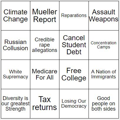 I thought about proposing a drinking game where you would take a drink everytime someone mentioned Trump but I was afraid I would be charged with attempted murder after people ended up in the ER with alcohol poisoning in the first five minutes of the debate. Instead I made a handy Democratic debate bingo card: