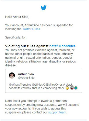 Well I went and did it and got permanently suspended from Twitter, and my account I have had for 9 years with over 13,000 tweets is gone. I appealed the suspension but apparently describing a sodomite with the term “sodomite” is a no-no.