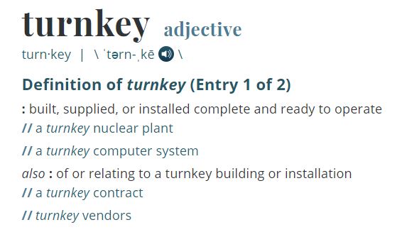 The idea of something being turnkey is that the work to build it has already been done. You don’t want an Ikea desk with ten million screws and bolts, you want a completed desk you can sit down at and start working on right away. Or a machine in a factory you start up instead of building from scratch. Normally turnkey stuff is more expensive, as much of the prep work is already done, plus it is done by experts.