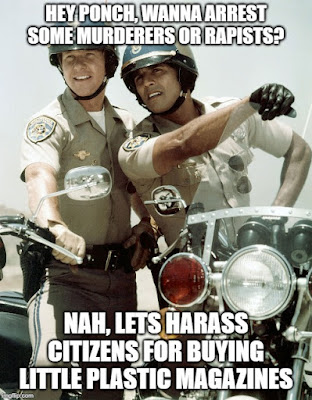 Still you get California law enforcement conducting surreptitious surveillance on California residents shopping in neighboring states and then lying in wait for them to cross the border so they can be arrested for possessing some plastic magazines for the most popular rifle sold in America.