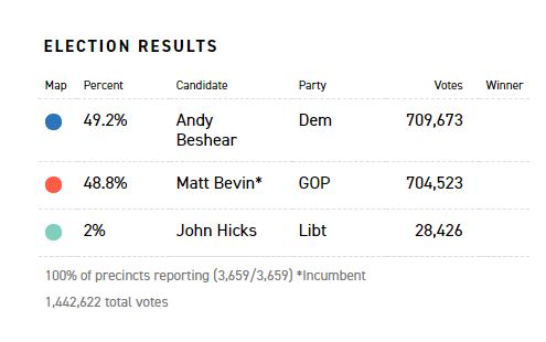 Kentucky held themselves a li’l ol’ election last night and it looks like Democrat Andy Beshear defeated the incumbent Republican Matt Bevin. Keep in mind that in 2016 Trump won Kentucky by 62.5% to 32.7%, which is about a 30% gap and Trump showed up to campaign for Bevin. A lot is being made of this by the mainstream media, and understandably so, but something that jumped out at me was this: