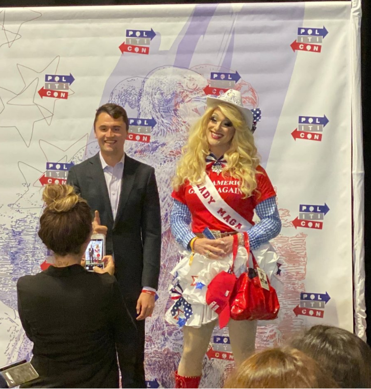 What is the alternative? Not the NormieCon Republican party. Modern “conservatism” hasn’t found any issue or principle it will stand firm on other than unwavering support for Israel. Anything else, even stuff that Republicans railed against five years ago, is now negotiable. Exhibit A, “conservative” Charlie Kirk (pre-groyper) awkwardly standing next to a transvestite (“Lady Maga”, this degenerate even had a sash made for his grotesque outfit) that is apparently what it now means to be a “conservative”.