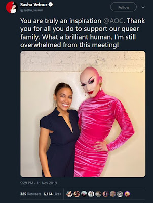 Just last night, top heavy dimwit Alexandria Ocasio-Cortez was in attendance at an exhibition of degeneracy put on by a trannie who calls himself Sasha Velour.