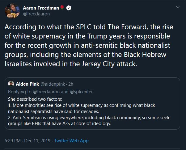 So instead of focusing on the actual attacker, they pivot to blaming Trump and “white supremacy”, as if black supremacists are justified in their hatred of white people in spite of Trump spending all of his waking moments trying to find new ways to suck up to Israel and most of his supporters are just as fanatical in their devotion to defending Israel, sending them money and upholding our “Judeo-Christian values: