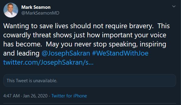 Dr. Seamon still has this tweet up but the original tweet is gone. Dr. Sakran didn’t protect his account or block me, his account is still there. No explanation from the good doctor as to why he deleted this threat, his last tweet from was three days ago when he expressed sorrow at the death of rapist sportsball hero Kobe Bryant. No explanation of what happened or why he deleted his tweet.