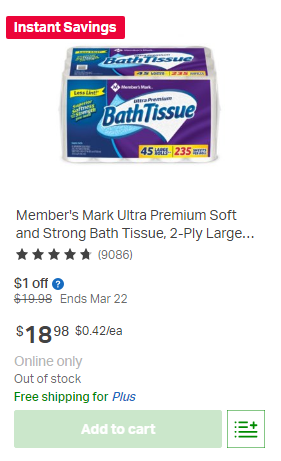 Anyway, there was a different package available but I have never seen their Members Mark toilet paper out of stock.