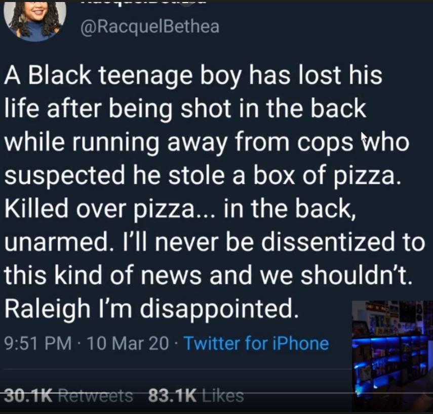The shooting led to protests with the tired, obligatory “No justice, no peace” chanting. Then the bodycam footage was released. Oops, turns out the “teen” had a gun, bolted as soon as police showed up with the gun clearly visible in his waistband and had the gun in his hand when the cop shot him. A lot of this was kicked off by a tweet from a relative nobody named Racquel Bethea. The tweet is gone but I took a screenshot from Donut’s video….