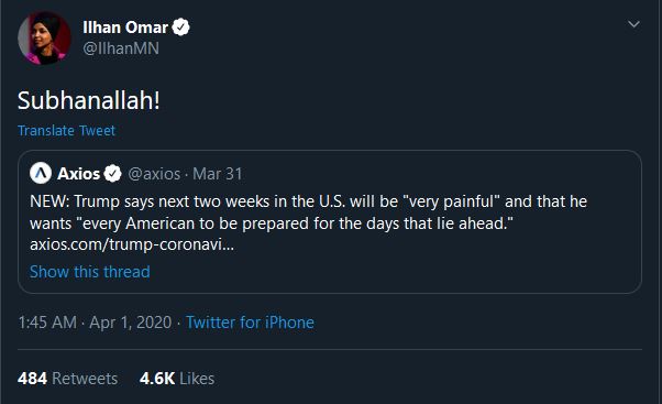 If Ilhan Omar wants to praise her savage desert deity for smiting American with coronavirus, that is her business but she should be doing so from Somalia, not America.