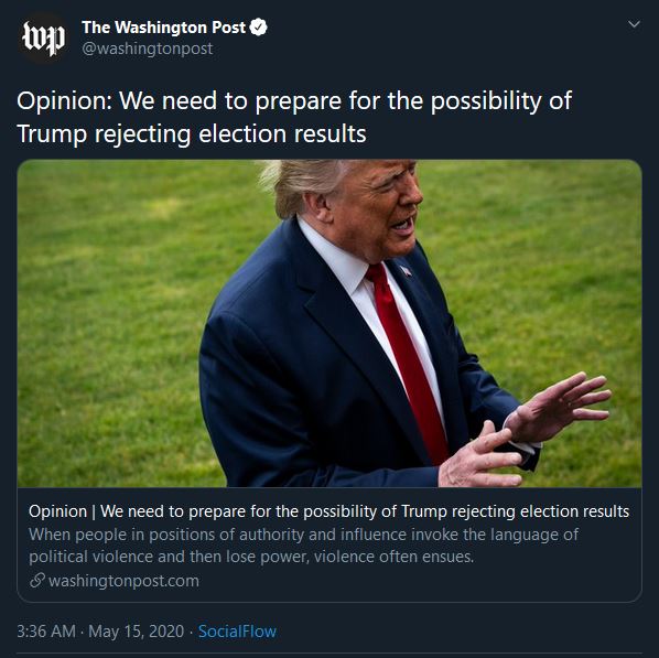 This editorial at the WaPo is another example of the projection from the Left. If Trump loses in November, as is reasonably likely even though he is running against a credibly accused rapist suffering from dementia, his supporters will be upset but they will go on with their lives because that is what people who support Trump do: raise families, go to work, pay taxes. If he wins re-election? I expect some significant violent civil unrest. Past behavior from the Left supports that contention.