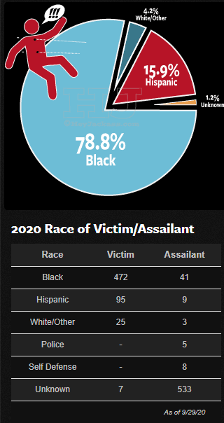 Let’s do a little math. White people are about 1/3 of the population, blacks are about 1/3 and mestizos of various sort are slightly less than 1/3. When it comes to murder victims though? Of the 599 people identified by race (this is slightly out of date, HJ has it as of 9/29/20), 472 are black. That means that black folk make up almost a whopping 80% of racially identified murder victims. Mestizos are about 16%, significantly less than their population as a whole and Whites (including “others”) are only about 4% of the population, compared to be 31.7% of the population of Chicago.