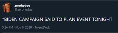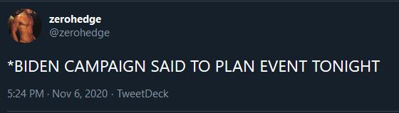 The election boards in the disputed areas have been slow walking the coup. Dribs and drabs of Biden “taking the lead”. Biden issues statements counseling patience and his fellow conspirators are uttering pious sounding bleating likes “count all the votes”, something no one is disputing provided the votes are a) legitimate and b) were cast on time. It is a giant psyop to convince the normies that Biden won and it is Trump being unreasonable.