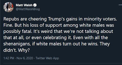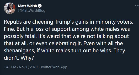 The group that Trump had to win to be re-elected, White men, he did worse with than in 2016. Trump has been focused on every group except the one that elected him in the first place. Even Matt Walsh, who seems to be slowly waking up, understands this.