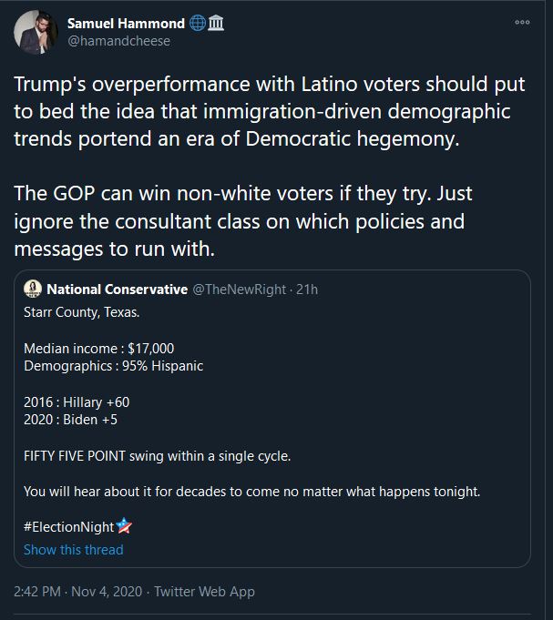 A recognizable Republican party doesn’t win without big turnout from White voters and that failed to materialize. Trump didn’t even get a third of mestizo voters or Asian voters. Those are the groups who are poised to increase their numbers drastically under a Biden administration. It is simple math, if you lose 2 to 1 with new voters, you lose every election. The math favors the Left and they know it. They may have gotten ahead of themselves in 2020 as they often do but victory is in their grasp. Even if White voters have a significant awakening it is too late as we will be swamped unless we somehow started to see Republicans getting 80% of the White vote which just isn’t going to happen.