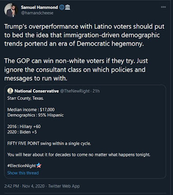 There was a lot of cheering that the Republican party is now the party of the working class, which it already was under Trump, and obviously they just need to pander harder to non-White voters to remain electorally viable. The exit polls show a different story.
