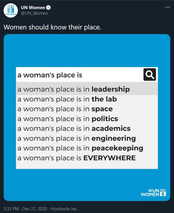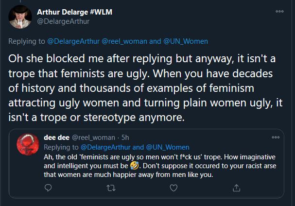 It reminded me of an exchange on Twatter. The UN Women account, the same UN that sends “peacekeepers” from third world nations to other third world nations to spead cholera and apparently wholesale rape the ladies on an industrial scale, posted something typically stupid: