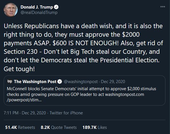 But here is the catch. It is 2021 and trying to do things for the right reasons is now bad. Even Trump on his way out pointed out that this is politically suicidal, especially right before the special elections in Georgia with the Senate balance on the line: