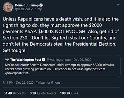 Meanwhile in the political landscape the big news last week was that after Trump said he wasn’t going to sign the enormous bloated bill originally passed by Congress with $600 for the peasants and billions for foreign countries, including Our (Already Wealthy) Greatest Ally, he rolled over with nothing to lose and nothing to gain and signed it anyway. Sure he made a bunch of noise about things he wanted and everyone knows he isn’t going to get but one thing he did say was a freaking wrapped up with a bow on top present for the Democrats. Trump declared that we need $2000/person payments and for us that would mean an additional $10,000.