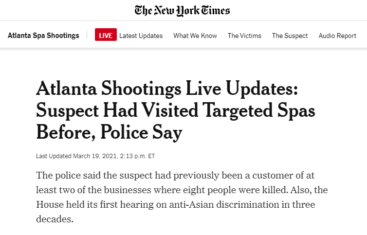 The New York Times uncharacteristically provides some much needed context to the shootings at Atlanta area “massage parlors”, aka “rub and tug joints run by Asians”: Atlanta Shootings Live Updates: Suspect Had Visited Targeted Spas Before, Police Say
