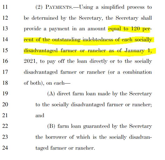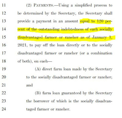 Not only do “disadvantaged farmers” get their loans paid off, they get a little extra. So if you are Sheeit’quarius the corn farmer in Alabama and you have a $100,000 loan, you get $120,000 to pay off the loan plus give you a little extra. Isn’t that swell!
