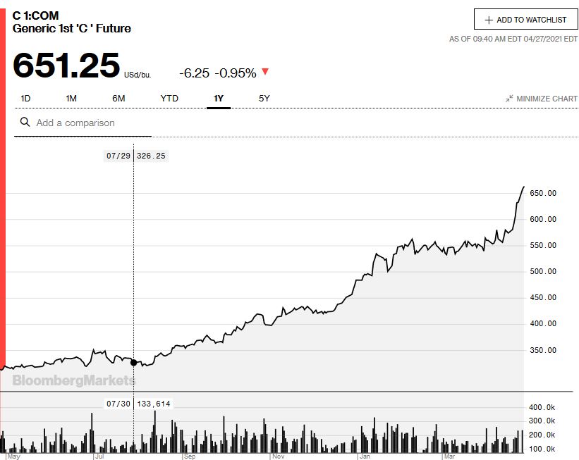 This morning I had my van in at the dealership for an oil change (I had a coupon) and while I waited they had RFD TV on in the room. Lots of commercials for fungicide and tractors and rodeos. One thing jumped out at me and that was corn prices. They have spiked recently after a year long run up….