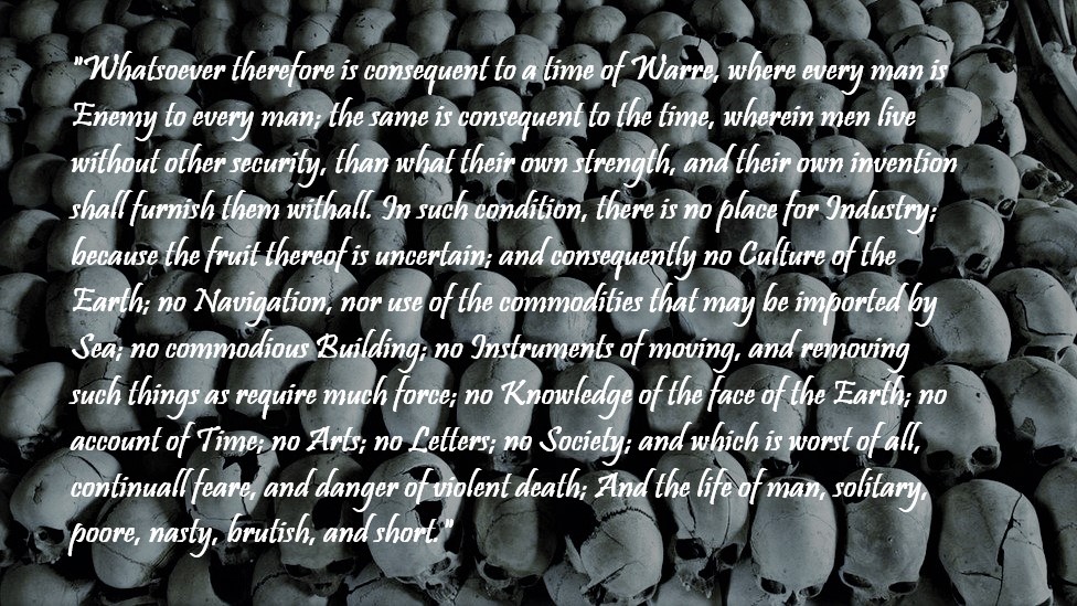 What no one seems to understand is that this state of existence is a tiny aberration in human history. The Great Depression and the Dust Bowl were just a century ago in America and famine and genocide are contemporary issues in much of the world. This state of life without much in the way of danger other than driving too fast and eating too much is almost completely without precedent in human history. Life is far more often solitary, poor, nasty, brutish, and short than it is Disneyworld vacations and standing in line to get the newest iPhone. Thomas Hobbes was depressingly correct when he wrote in ‘Leviathan’: