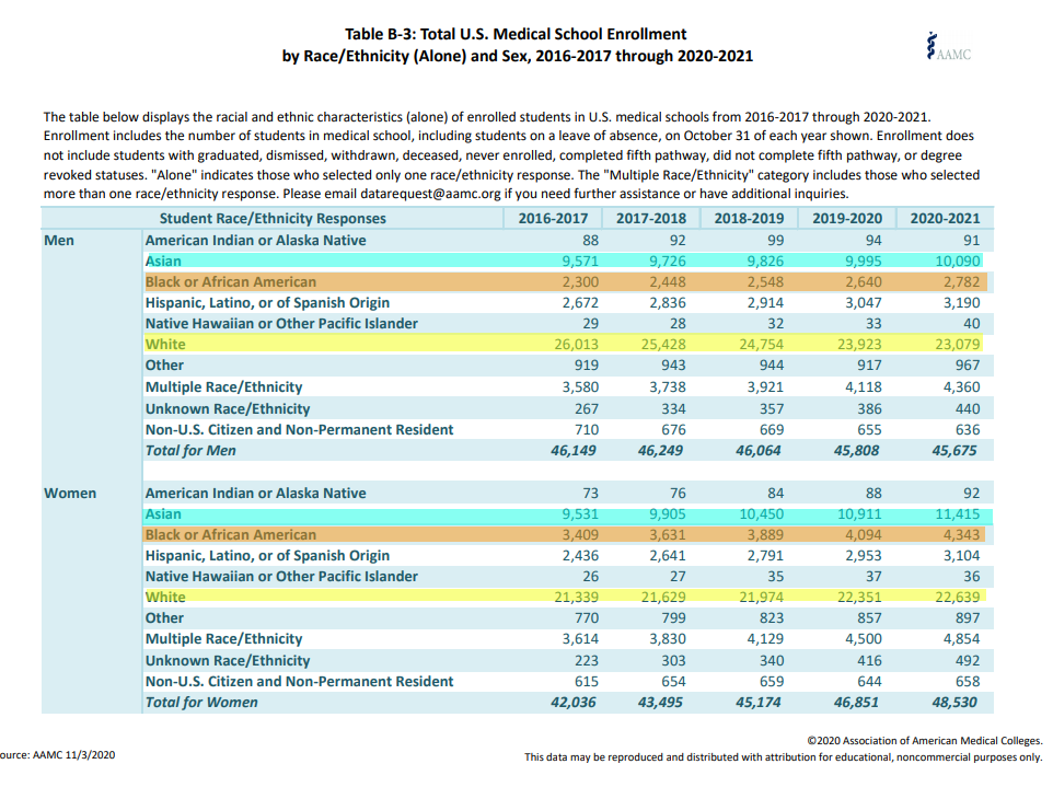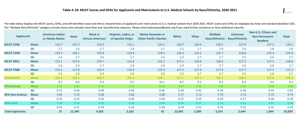 This isn’t really new. Like most college programs, medical schools have been giving preferential treatment to non-White/Asian students for a long time in order to have enough non-Whites in their promotional photos. It is not a stretch to say that the standards for admission for blacks and mestizos are completely separate from those for Whites and Asians. This is the data from The AAMC, the organization that pretty much runs the medical school admission process, from the MCAT test to the admissions process. Prospective students apply through the AAMC portal to the schools they want to attend and then later use a different system to apply for residency.