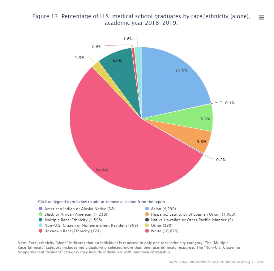 – On the other hand, Whites are slightly less than half of new medical school students (48.5%), but they are 54.6% of the graduates indicating that Whites do very well in the high pressure, high achievement world of medical school compared to other races.