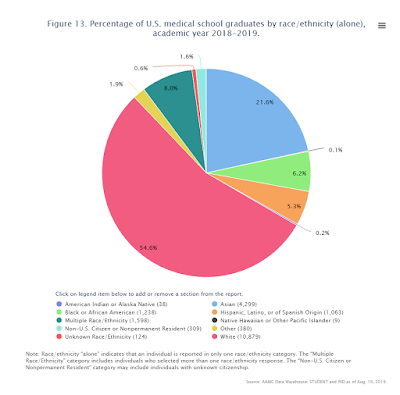 Getting into medical school was historically one of the most difficult academic achievements in our educational system. Anyone can get accepted to a college and most people of modest intelligence can get into post-grad programs, especially in low rigor fields like education and the liberal arts. But medical school demanded a very high GPA, outstanding MCAT scores and lots of extra-curricular activities. No surprise, this has resulted in a skewed racial distribution among medical school students (click to enlarge):