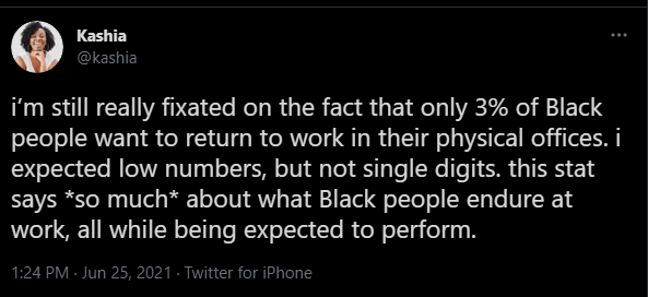 What is this 'workplace' that blacks are so fearful of returning to? The ONLY times I've ever seen black females in an office environment, it has been some sort of gubmint enterprise, fed or local, and they are never outnumbered by Whites or anyone else. Of the couple of hundred souls at my place of business (defense contractor) there is precisely one black – a cheerful old fellow who toils as a janitor. My employer is so ultra-woke that we would hire the first negro who came through the doors, waiving any consideration of skills, experience, criminal history, etc. But none ever do. It's not that there is any shortage of blacks in the surrounding area. They just do not bother looking for work other than entitlement positions.