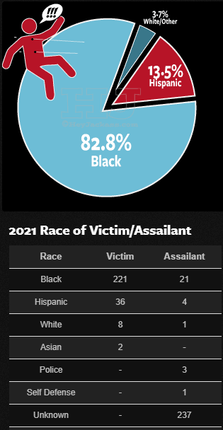 There have been 289 homicides in Chicago so far this year. A whopping 8 homicides involved a White victim, or about 2.5% and only 2 involved an Asian. With 2.7 million people in Chicago, 31.7% White, that means than of around 855,000 White people in Chicago there have been only 8 murders in 2021. That is still 8 too many but that is one murder per 100,000 White people. There are a similar number of blacks, 32.9% or 888,300, but 221 blacks have been murdered in Chicago or 27 times as many as Whites despite a similar sized population.
